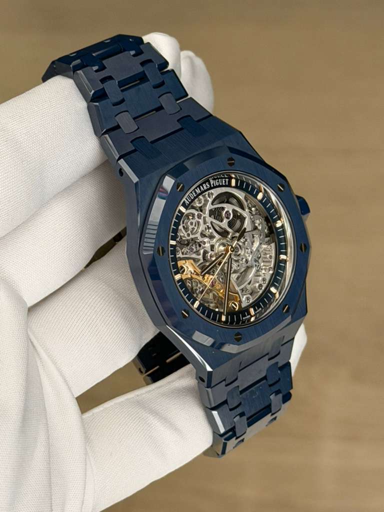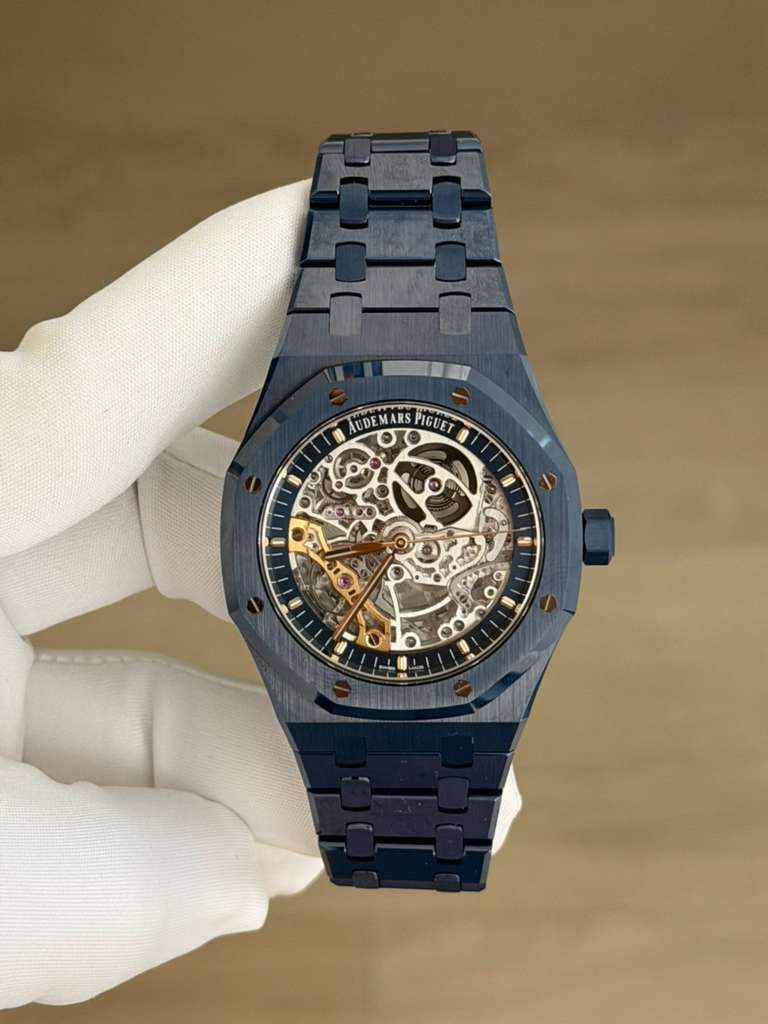 The Audemars Piguet Royal Oak 15416CD is an exceptional showcase of high horology, crafted in blue ceramic and featuring an intricate openworked perpetual calendar. Its 41mm Royal Oak case houses AP’s ultra-thin perpetual calendar movement, revealing extraordinary mechanical depth and finishing.