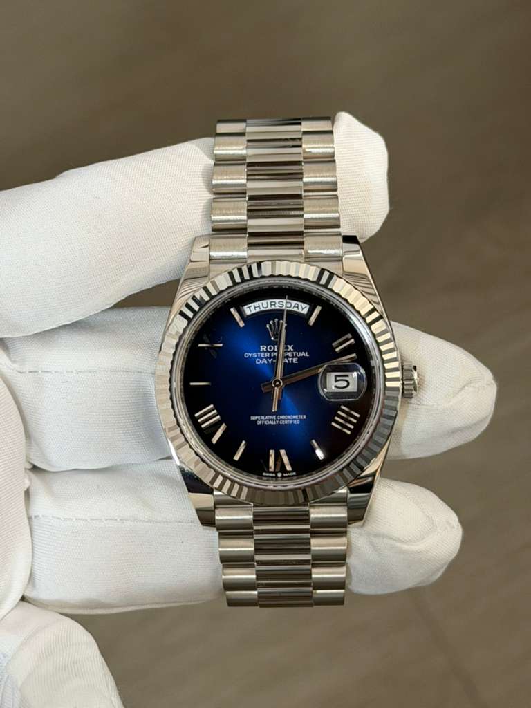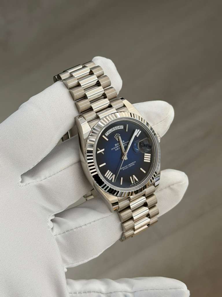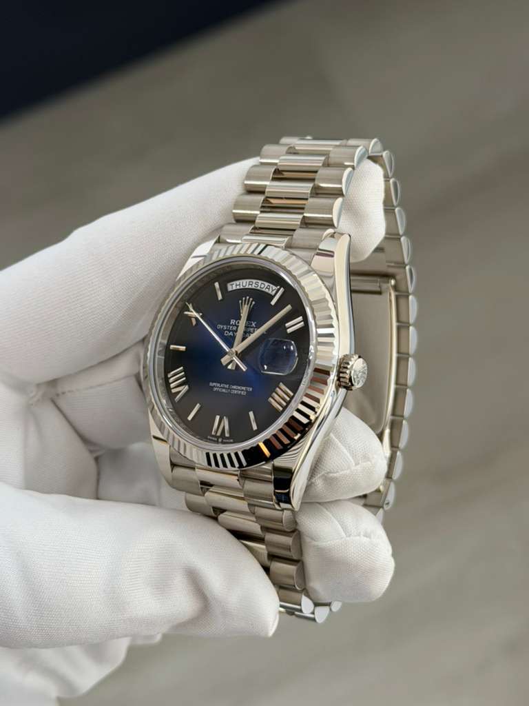 The Rolex Day-Date 228239 is crafted in 18k white gold, representing the pinnacle of Rolex prestige and refinement. Featuring a 40mm Oyster case, this reference is powered by the advanced Caliber 3255, delivering exceptional accuracy, power reserve, and reliability.